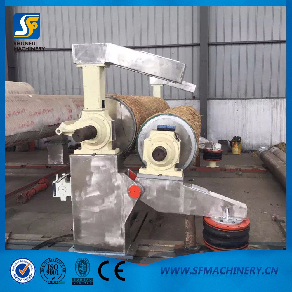 施胶机结构型式为斜列式施胶机,主要有由上下施胶辊装置、机架、双辊挡胶装置、橄榄辊装置、分纸辊装置、喷胶管装置、承胶管装置、喷雾装置、引纸绳装置、汽胎加压系统及控制系统等组成。本施胶机采用两辊驱动方式,开区引纸,施胶机进出口配可调节分纸辊一辊,施胶机出口配镀铬橄榄辊一根(带引纸装置,形式是活动引纸轮),同时两侧配有胶料溢流回收接料装置,喷胶压榨采用气动加压